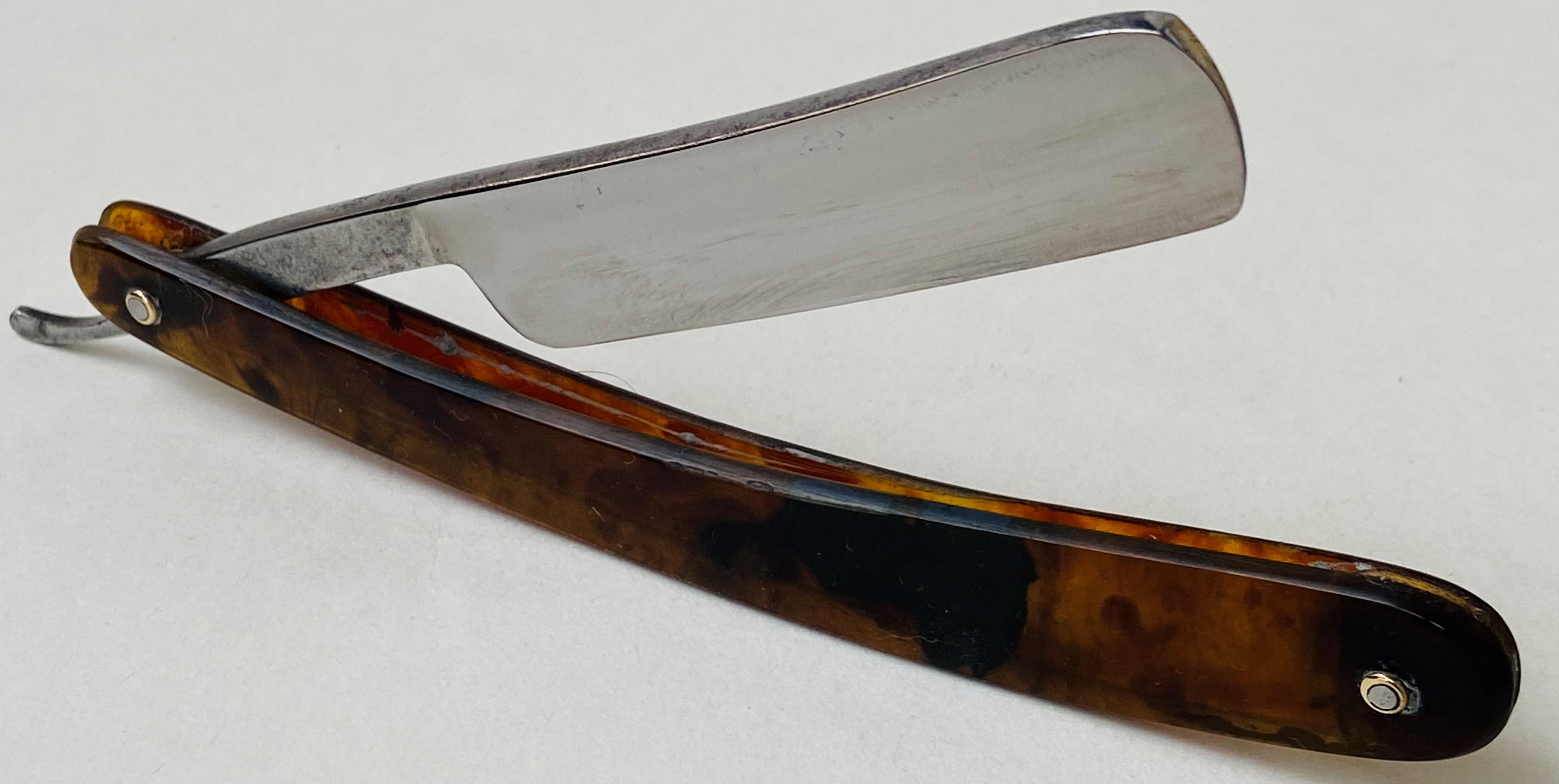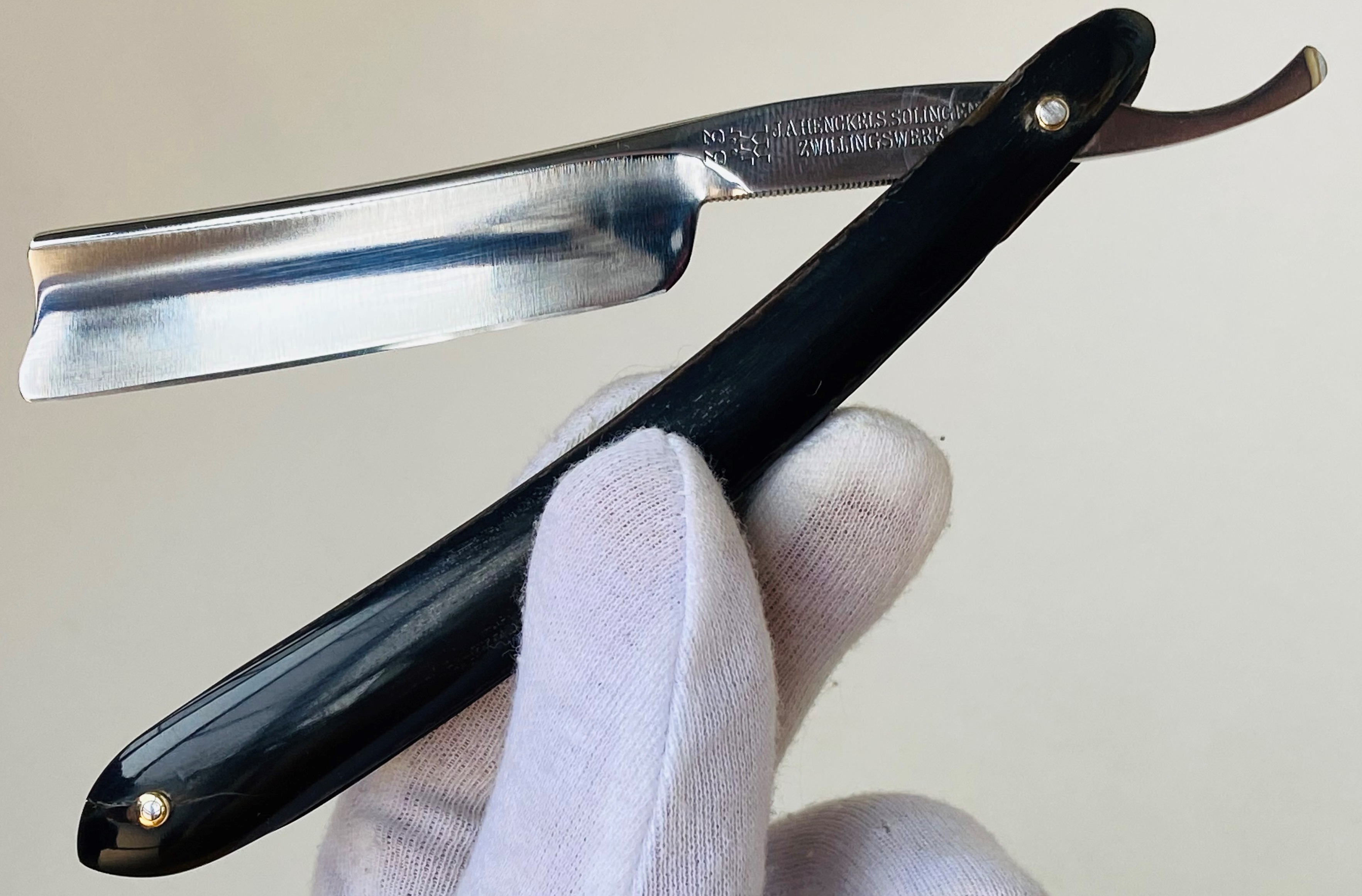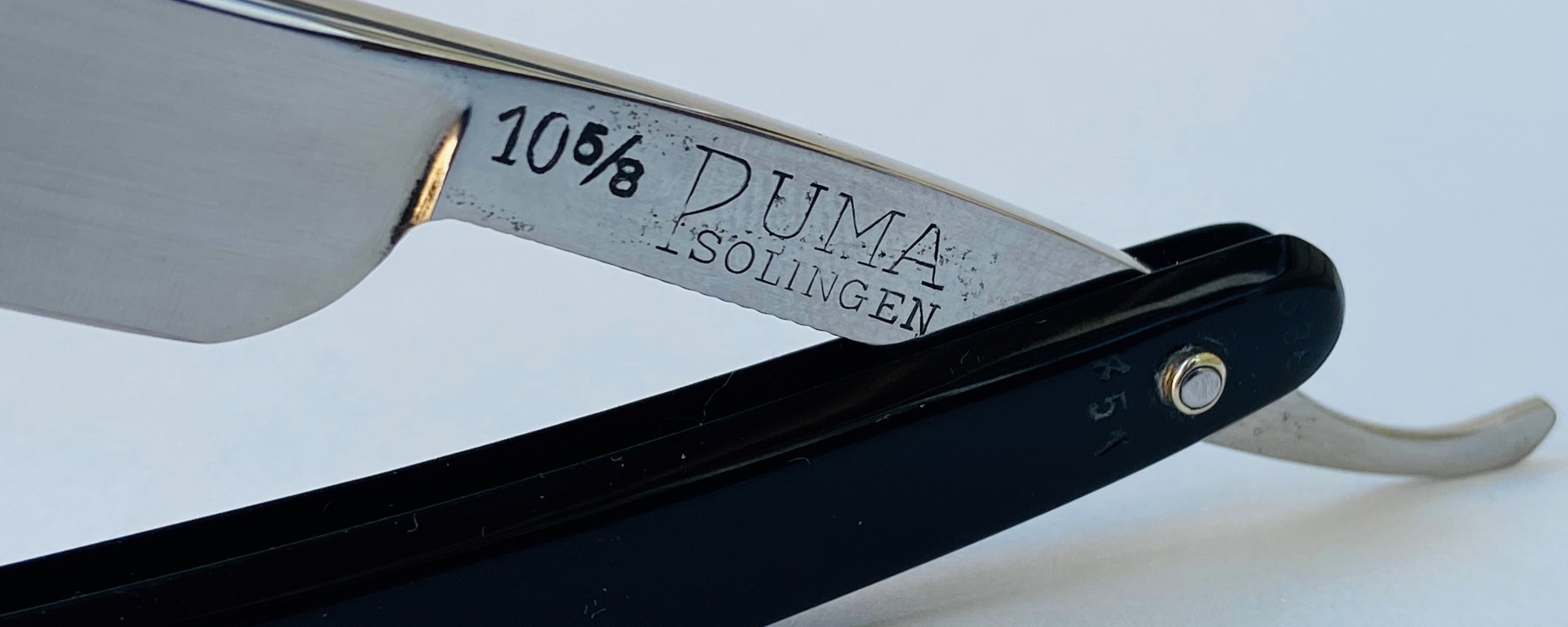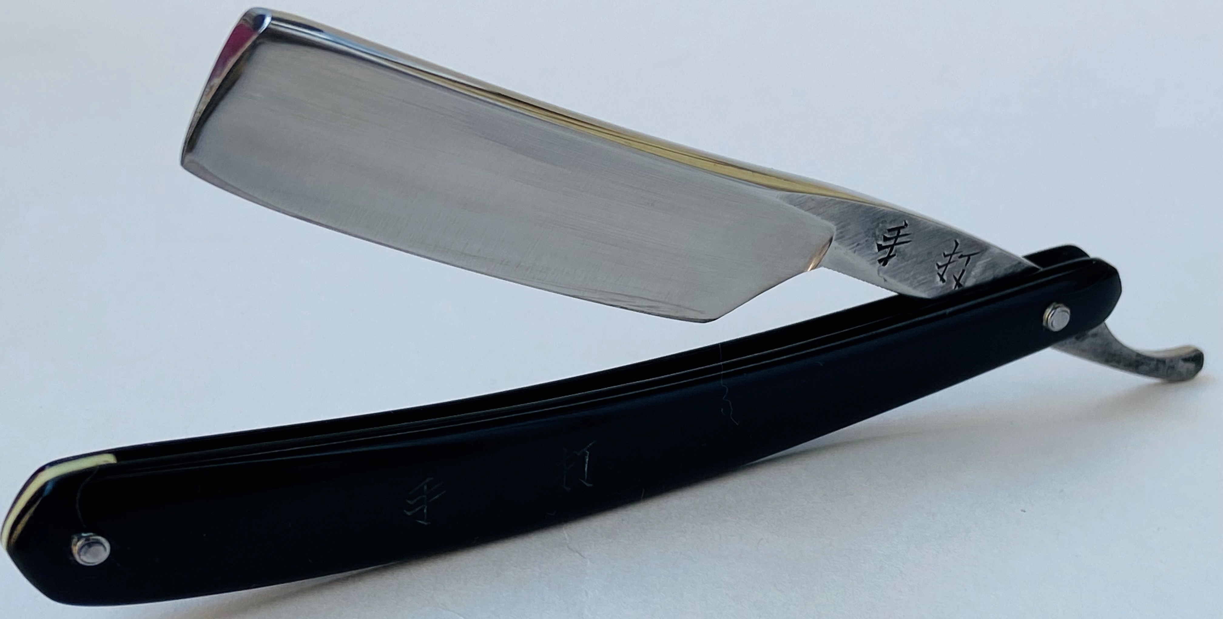 Бритва без активных следов пользовании и находится в прекрасном состоянии для своих преклонных лет.Для порядка перебрал бритву, заменив внутренние шайбы,но заново поставив оригинальные пины на место.Умеренная шлифовка и полировка полотна.Кромочка равномерна по всей длине.Тяжёлая и мощная бритва.Оправа ровная,в идеале.Заточена и готова к бритью.