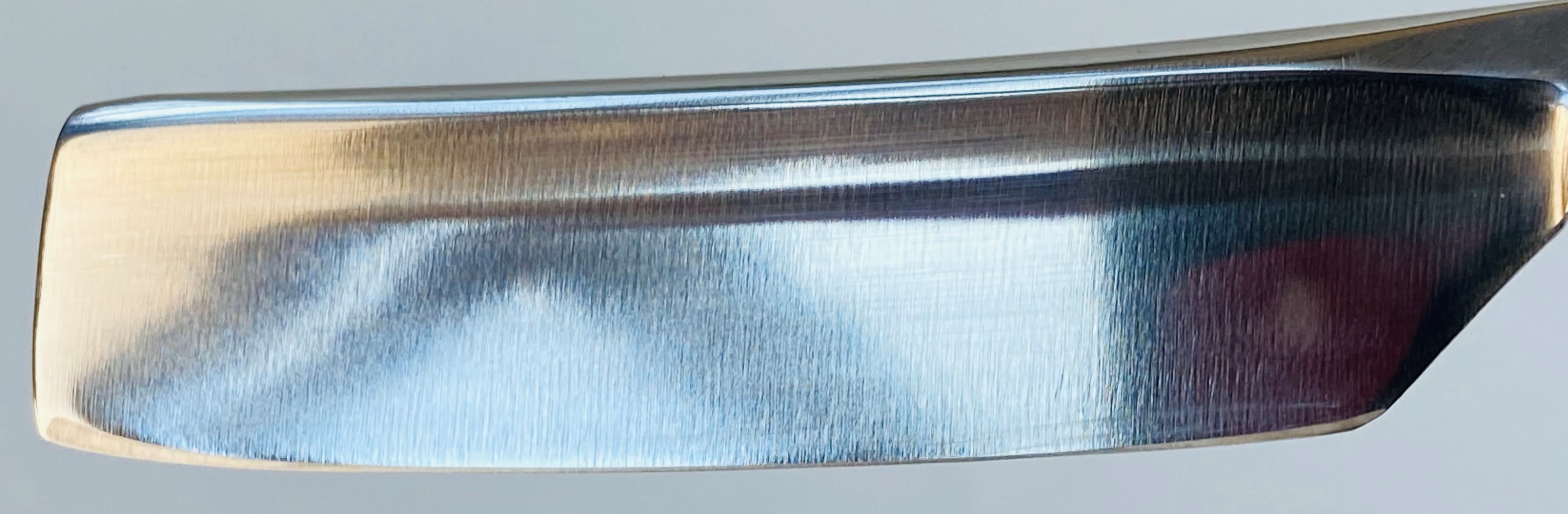 Отлично проявился след-переход от закалки клинка. Также, как на топовых бритвах Ивасаки и Камиджо Юкио. Красивая, мощная, тяжёлая и не часто встречающаяся бритва,так что не пропустите!