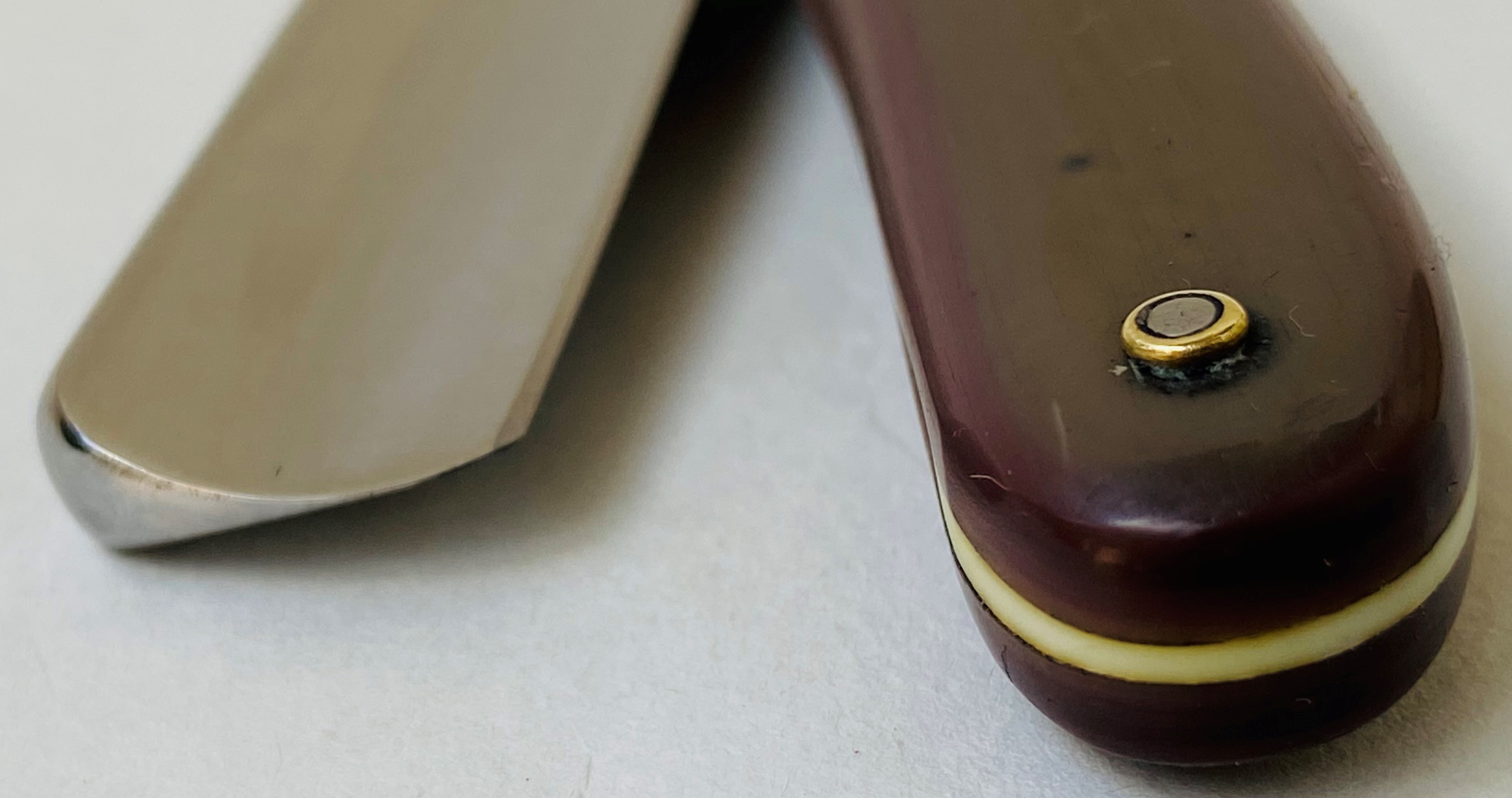 Бритва хоть и пользованная,но находится в очень хорошем состоянии для своих лет. По всей видимости была в пользовании у барбера,так как немного задран носик.Была разобрана, для приведения клинка в порядок.Шлифовка и умеренная полировка. Кромочка равномерна по всей длине.Оригинальные пины были перебраны и заново поставлены. Родная оправа ровная и мощная.( Небольшая трещинка в районе нижнего пина была надёжно проклеена с обеих сторон,отшлифована и отполирована.Так что практически незаметно и ни на что не влияет).