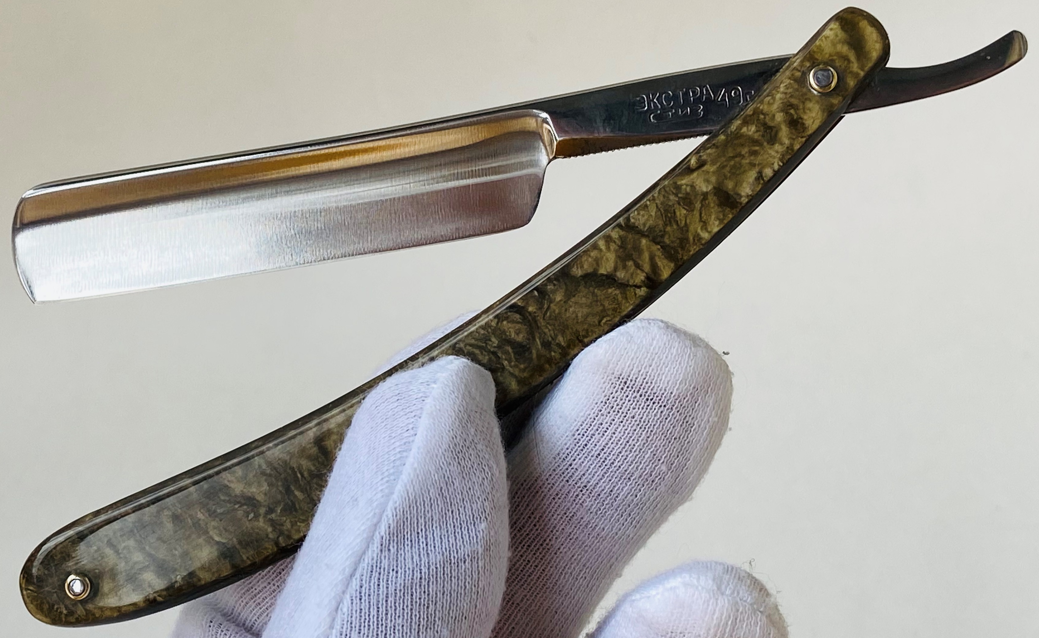 Бритва в состоянии близком к идеальному. Самая крупная и "горбатая" бритва из всей линейки Стиз. Бритва без следов пользования и по всей видимости в работе не была. Нет следов от заточных камней на обушке.Оригинальная шлифовка и полировка клинка.Кромочка тоненькая по всей длине.Перебрал бритву, чтобы добавить внутренние шайбы и поменять заклепки на более практичные втулки.Шикарная и не часто встречающаяся оправа малахитового оттенка. Коробочка оригинальная также 1955 года. Короче, полный комплект.Бритва заточена и готова к бритью.