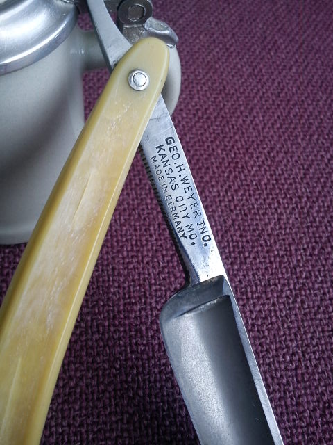 И еще бритва этой фирмы...Юбелейная.По всему видно концы лезвий обломились...кто-то их подрезал аккуратно...укоротил...Обидно Re: GEO.H.WEYER. KANSAS CITY MO.Rumata:Классные бритвы, только у тебя на всех снимках одна и та же композиция (фирменный знак с кружкой?), поэтому не очень просто масштаб на глаз определить, да и пятое по счету фото тяготит имхо... Кружка у тебя 0,3л или 0,5л? Это я так, к слову...