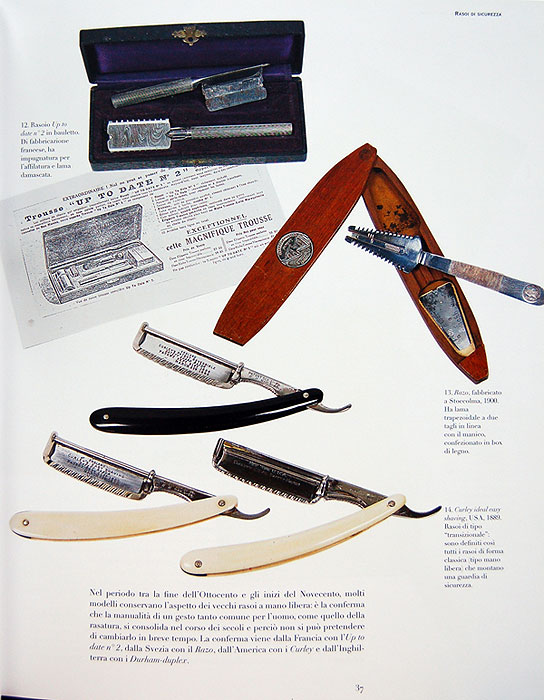 Теперь серьёзно. Сканы книги, обещанные Олег Бритва'ом выкладываю, но немного, чтобы сохранить интригу По поводу обзора - это сложнее, так как по итальянски знаю всего пару слов. Однако кое что сказать о книге могу. Книга разделена на несколько частей, в первой из которых автор описывает разнообразные виды бритв и аксессуаров для бритья: опасные, безопасные классические бритвы; помазки, чашечки для взбивания пены, ремни для правки, приспособления для заточки сменных бритвенных лезвий и т. п. Много внимания уделено истории развития бритвенных приспособлений и самих бритв. Вторая часть книги посвящена истории и культуре ношения бороды и усов в разные эпохи разными национальностями, тут автор берет за основу образ исторической личности и на её примере раскрывает тенденции развития моды на бороды и усы. Третья часть, как я понял (могу ошибаться) повествует о развитии брадобрейского дела. Вот в принципе и все что лежало на поверхности. Далее нужно переводить и разбираться...