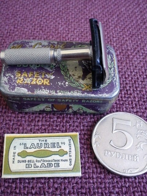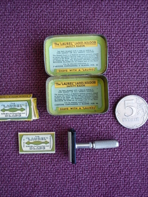 Re: Т-образные станки !Станок "THE LAUREL" Ladies Boudoir.Станок для леди.Для сравнения положил монету...Еще есть два микроскопических лезвия.Что может выбрить леди такой малюткой...Если только усы...бывают же усатые леди