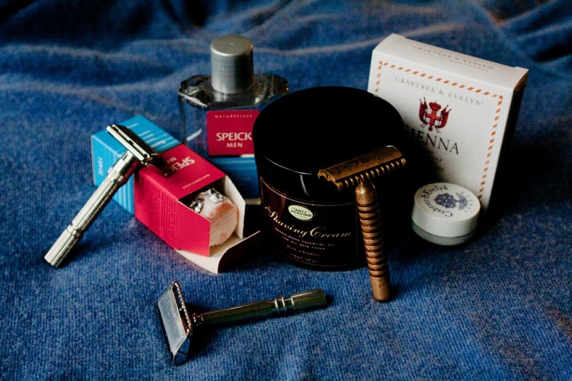 На фото мой набор для бритья: кожа с ГОИ, кожа для правки, кусок войлока для полировки, и собственно бритва. Ну про качество рукояти я уже писал...