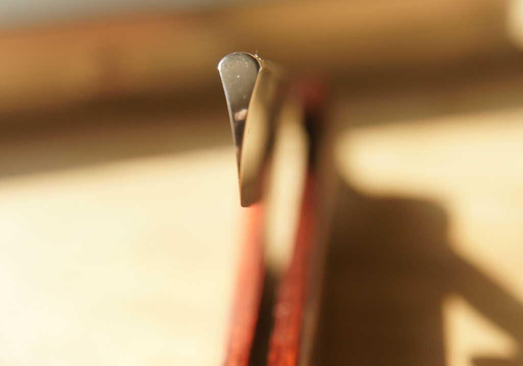 Прокладкой между частями ручки служит свинцовый металл. К сожалению, такие перламутровые ручки довольно хрупки. Большая удача для современного коллекционера – найти образец этой красивейшей ручки без трещин и сколов. Мне повезло найти две такие бритвы, но обе были со сломанными ручками. Было отмечено, что ручки были разных размеров под разную ширину бритв.