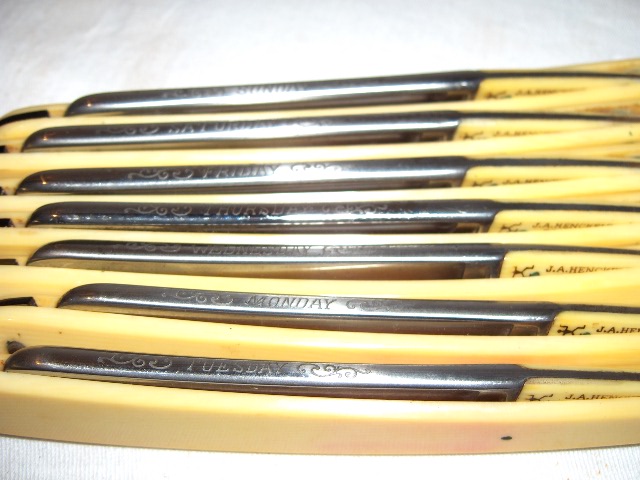 Недельный набор из семи бритв Henckels имеет на спинке каждого лезвия название дня недели по-английски. Ручки из слоновой кости имеют элегантные резкие концы. Половинки ручек разделены цветастой янтарной перегородкой. Хвостовик и эрль в стиле Хенкельс закрыты слоновой костью. Этот столь желанный набор был упакован в дубовый футляр, покрытый изнутри фиолетовым бархатом или атласной тканью.