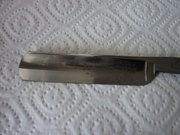 Подскажите можно ли бритву вернуть к жизниЗдравствуйте. Вот попала в руки такая бритва. При детальном осмотре с помощью лупы выяснилось что имеется трещина, от РК к обушку примерно 2мм, ну может 2.5-3. там уже не видно. Можно ее починить, если сточить 2-3мм полотна? Ведь тогда угол заточки РК станет тупее, и как такой угол может повлиять на бритье? Красным отмечено где трещина