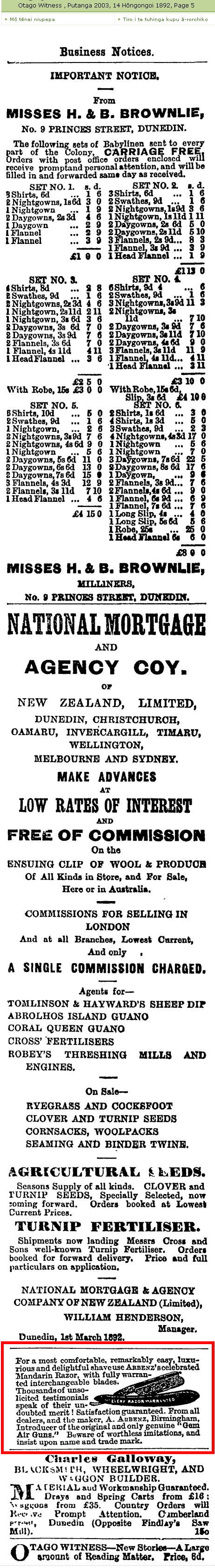 Spoiler Show McPherson Brothers (1891) McPHERSON BROTHERS, Cutlers, 156, Argyle Street, and 134, Trongate, Glasgow. The important and prosperous cutlery business now conducted at Glasgow by Messrs. McPherson Brothers presents an interesting example of rapid commercial advancement, considering that the firm only commenced some ten years ago, and have since acquired a noteworthiness and distinction consistent with the enterprise under which their business has been developed. Messrs. McPherson first began business at 134, Trongate, and the rapid extension of trade that followed their operations necessitated such outlet as was afterwards provided by the acquisition of the Argyle Street establishment, long occupied by Messrs. Reid & Sons in the same line of trade. Both houses are now thoroughly representative of the high-class cutlery trade, and are fitted and appointed in a manner that renders them attractive features of the two busy thoroughfares in which they are respectively located. Besides all the miscellaneous items embraced in a first-class cutlery stock, both establishments are replete with every description of tradesmen’s tools, ironmongery, fishing tackle, guns, revolvers. &c. ; and sporting men will here find everything requisite for shooting or fishing, from a single article to a complete equipment, at terms equally favourable with those of the several depots devoting exclusive attention to these branches. The Trongate shop, with its large frontage and admirable facilities for display, is one of the most attractive in its row, while the other at the corner of Mitchell Street and Argyle Street admits of a series of five show windows, wherein everything is effectively admitted to the inspection of the public. The entire appearance of the house is suggestive of its high standing and importance as one of the City’s leading cutlery emporia. Everything in the windows is priced on neat hand-printed labels, this artistic work being executed by one of the partners, and the arrangement of the whole items is in perfect accordance with good taste. The peculiar feature of the “Eureka” Scissors' is their curved or rounded blades, the advantage of which enables the user to cut through the thickest material with the greatest ease, the cutting power being many times greater than any other form of scissors in the market. They have nicely-finished nickel-plated shaped bows to fit the fingers, and are made in every variety and size, suitable either for domestic or warehouse use. All sizes and varieties are kept in stock by this firm. The whole of the specialties provided by Messrs. McPherson bear the guarantee of universal testimony, and, as the firm deal only in goods calculated to afford the utmost satisfaction, they are in consequence favoured with the liberal support and patronage of many of the better classes. Their business is in itself an illustration of success following upon systems of tact and enterprise, and both partners are well known in social and commercial circles for the vigorous interest they manifest in improving and extending the resources of the trade in which they have acquired such well-deserved repute and distinction. http://glasgowwestaddress.co.uk/1891_Bo ... others.htm" onclick="window.open(this.href);return false; http://www.cartalana.ru/niva-37.php http://www.network54.com/Forum/661795/m ... Arbenz+Gem The British Medical Journal-Dec.1 1888 Spoiler Show ""MANDARIN RAZORS. WE have received from Mr. D. A. Arbenz, 107 and 108, Great Charles Street, Birmingham, specimens of his mandarin razors, of which we are able to speak in terms of commendation. While a bad razor is at all times a source of pain and annoyance to the user, a reliable, handy, and easy shaver is a convenience the utility of which cannot be overrated for individual, and especially for hospital, use. Arbenz's interchangeable blades are said to be made of the best English steel, are hardened and tempered to the highest degree of perfection, and finished ofT in the natural colour, so that their fine temper is not ruined by subsequent grinding and polishing, as is commonly the case with razors of the old construction, quality and durability in such instances being often sacrificed for the sake of an extra polish. These razors are supplied, with four interchangeable blades, in a neat velvet-lined case."" http://www.artisanshaving.org Spoiler Show