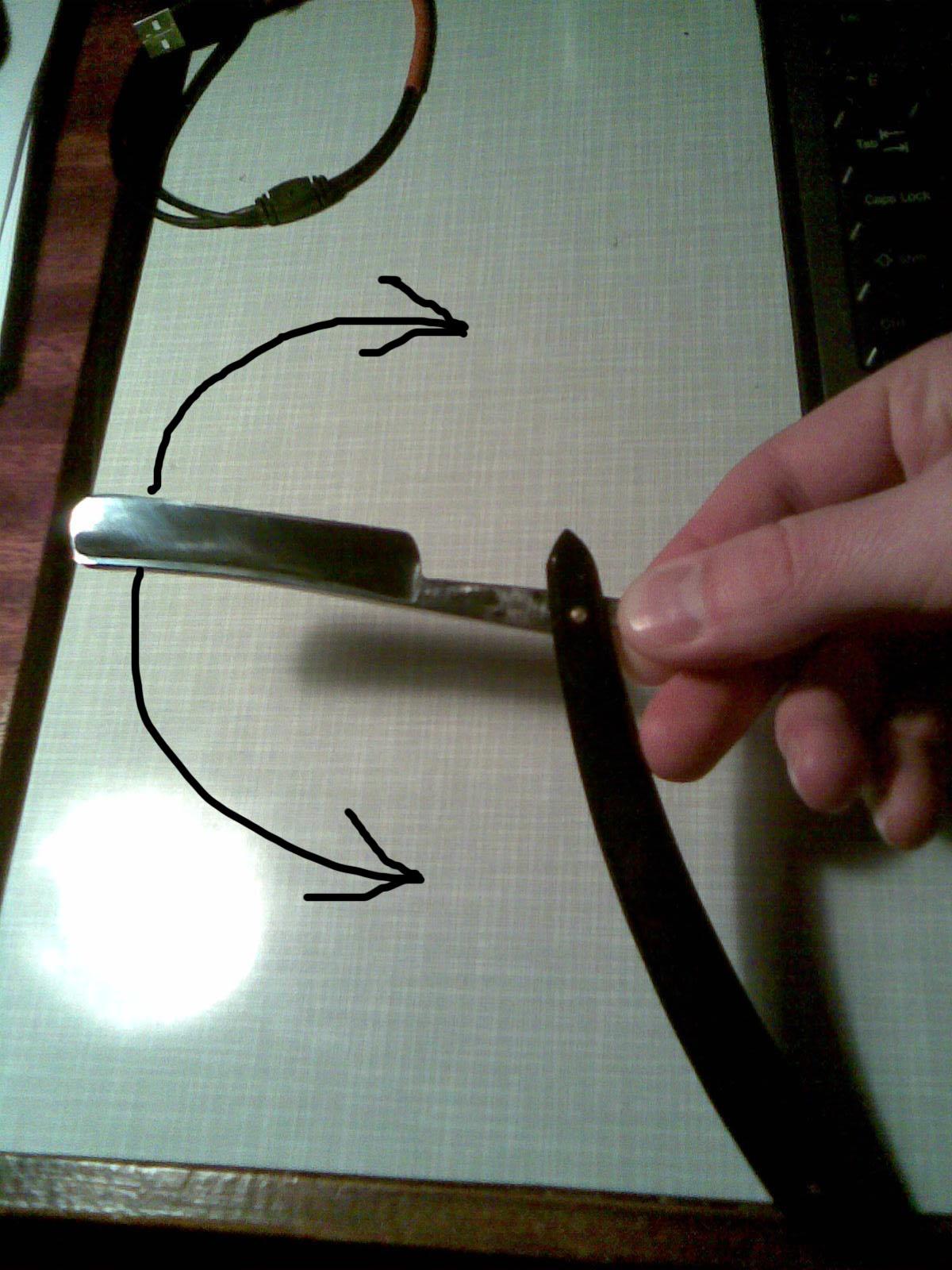 Re: Делимся первыми впечатлениями от бритья, советуем.Кстати, проблему нажима плотна на кожу решил следующим образом: беру бритву не как её принято держать классически с противопоставленными пальцами(при помощи трёх – четырёх точек опоры), а двумя пальцами за край хвостовика, причём с таким усилием, чтоб бритва могла в них свободно совершать веерные движения, когда ось вращения проходит через эти самые указательный и большой палец. И тут главное внимательность. С одной стороны подобное удержание даёт бритве большую степень свободы, что (правильно контролируя прижимное усилие пальцев) позволяет исключить сильный нажим бритвы на кожу(при увеличении нажима бритва как бы проворачивается в оси вращения). С другой в таком случае, при невнимательности возможны продольные движения, во вторых требуется несколько больше внимания на угол атаки бритвы к коже – в таком удержании бритва так же может выворачиваться, меняя угол. Что – то типо этого: