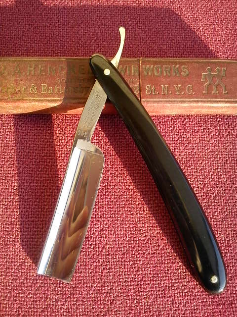 Некоторые бритвы Henckels уже отработали своё. Одно такое лезвие имеет знак Близнецов и ряд глубоко вытравленных цветов. Лезвие было найдено с резной ручкой, которая сделана предположительно из кости, несмотря на довольно бледный и гладкий вид поверхности. Большинство моделей резных ручек других фирм оформлены довольно несложно, в виде прямых линий или, возможно, резных вдоль края ручки. Резные ручки Henckels более сложны в оформлении, и бывают изменены даже по контуру. Задняя сторона хвостовика этой бритвы маркирована «GRAEF/SCHMIDT». Коробка из-под ножниц указывает на то, что эта фирма была какое-то время единственными торговыми представителями бритв Henckels в Соединённых Штатах.