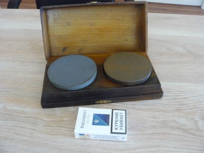 Исторически сложилось что камни для заточки топоров круглые, но они по моему меньше размером. А в коробочках и парами как правило притиры, но они либо больше размерами либо квадратные. Короче не рыба не мясо  А с абразивностью как? Если грубовато для бритв, то м.б. всеж для топоров.