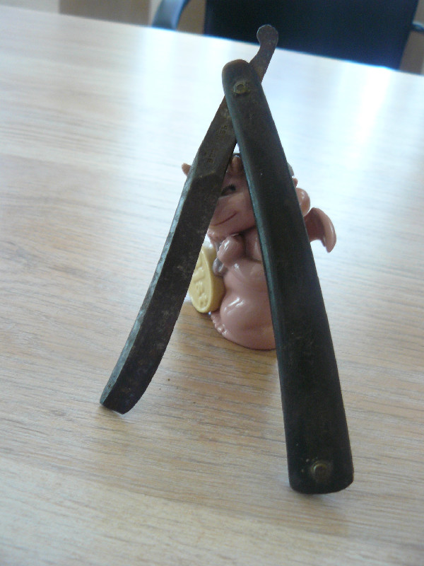 Одна бритва была куплена в кучке а в кучке много штучек. Ну бритва и бритва - по сути безымянная. Видать либо штамп плохо пробили либо сошлифовали много. Но при сильном всматривании видно окнчание штампа Батчера - стрела, мальтийский керст и надпись шеффилд. Видать отсутствие яркого штампа уберегло ее от бурной жизни.