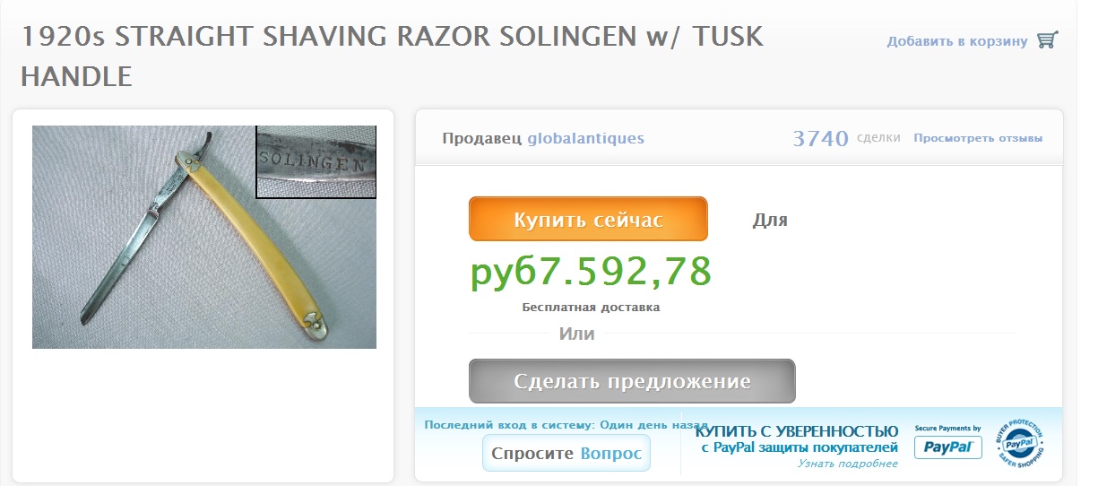 http://britva.ru/forum/viewtopic.php?p=9205#p9205" onclick="window.open(this.href);return false; Более 2-х лет назад. За это время много воды утекло, даже лот подрос в цене. Идотизм бесконечен! А воз и ныне там: Шыкарное описание! С такими фотами и описанием эта оглобля протянет ещё 10 лет... http://molotok.ru/show_item.php?item=1835043259" onclick="window.open(this.href);return false; Ремонт опасных бритв, звонить с 11-00 до 23-00, +79267729357, (viber, whats app, telegram, VK), спросить Олега.