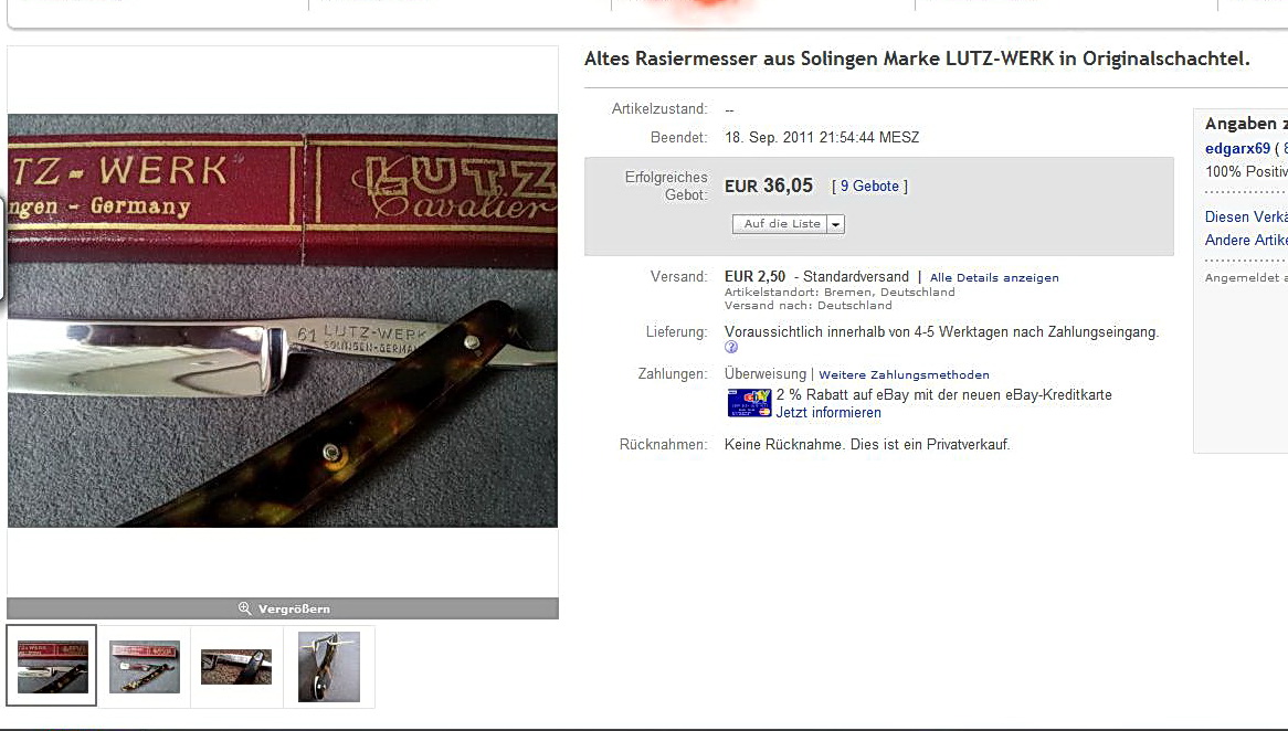 Предлагаю к оценке бритву LUTZ Solingen №61 Made in germany Re: Прошу помощи в оценке бритвы LUTZ Solingen18.09.11го продал в идеальном состоянии за 36 евро + 2,50 доставка.