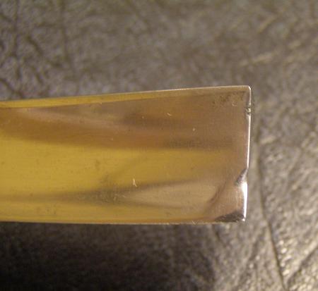 Re: Вопрос/опрос/шмопрос (про бритвы)Свежее поступление, "именитость" производителя под вопросом, но в целом бритва хорошая, и состояние достойное, но есть одно "НО": в начале лезвия имеется замятие - постарался передать на фото. Исправить можно: или обрезать нафиг 2-3 мм, либо "термообработка". В любом случае я этим заниматься точно не буду.