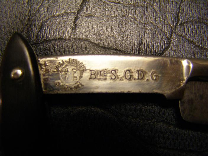 Клеймо на лезвии повторяет клеймо с обратной стороны эрла (Vrai Levier Garanty, в окружности кинжал и ключ, Bte S.G.D.G.).
