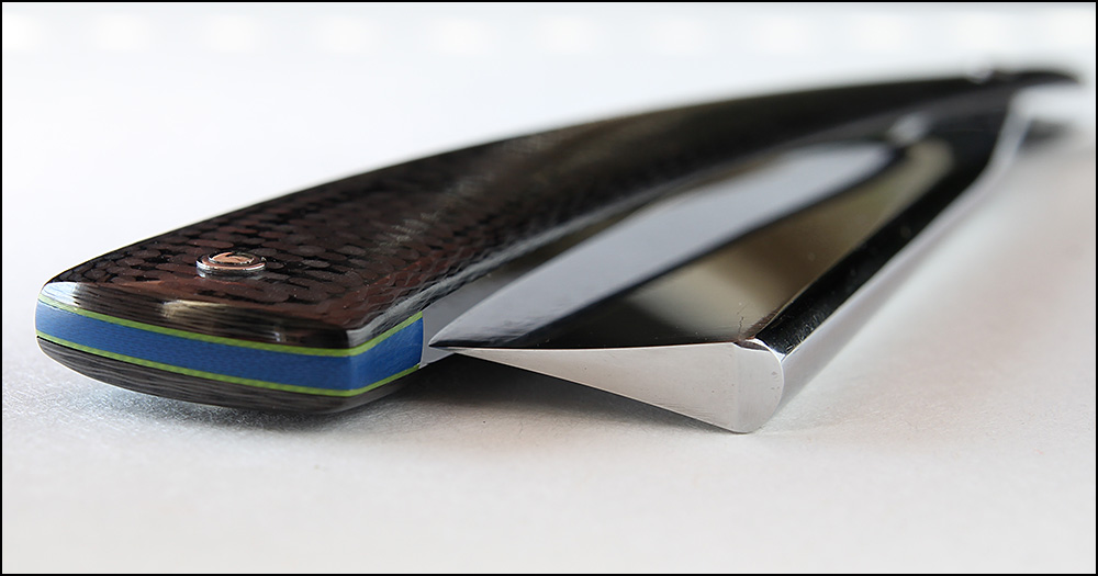 А можно еще ссылку на мастера? м.б. тему на стрйтразоре. Небольшая фаска на спинке не дает понять откуда она взялась если клин идеален, или он же всеж на пару десяток милиметров не клин? Но ручка карбон с такой бритвой - шик.