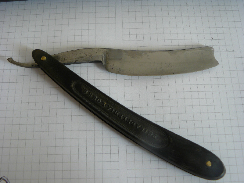 Насколько я знаю, это старая английская бритва из Шеффилда. По словам продавца, это конец 19 века. Но почему она такая "толстая", семь с небольшим мм, я имею в виду толщина обуха? Интересует примерный возраст и стоимость. Рукоять из рога, всего одна небольшая трещинка у пина. Да и вообще, накидайте информации побольше!