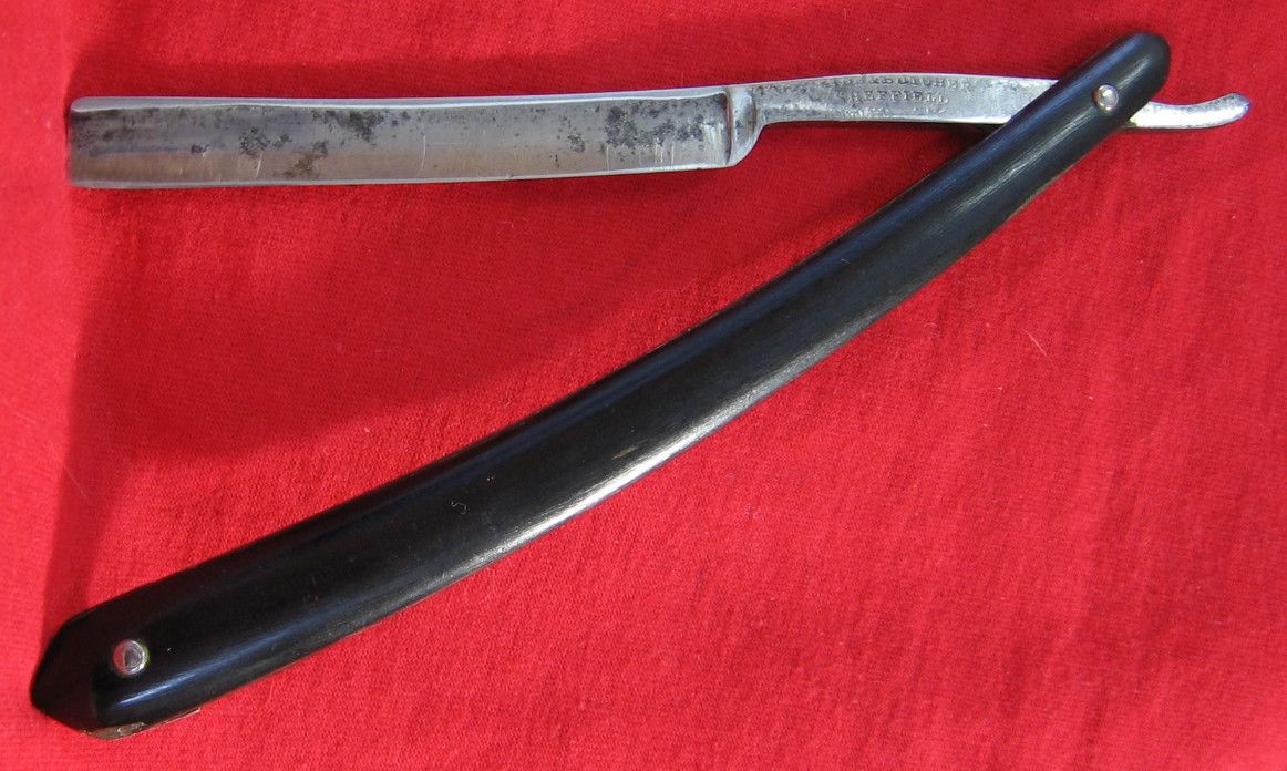 Насколько я знаю, это старая английская бритва из Шеффилда. По словам продавца, это конец 19 века. Но почему она такая "толстая", семь с небольшим мм, я имею в виду толщина обуха? Интересует примерный возраст и стоимость. Рукоять из рога, всего одна небольшая трещинка у пина. Да и вообще, накидайте информации побольше!