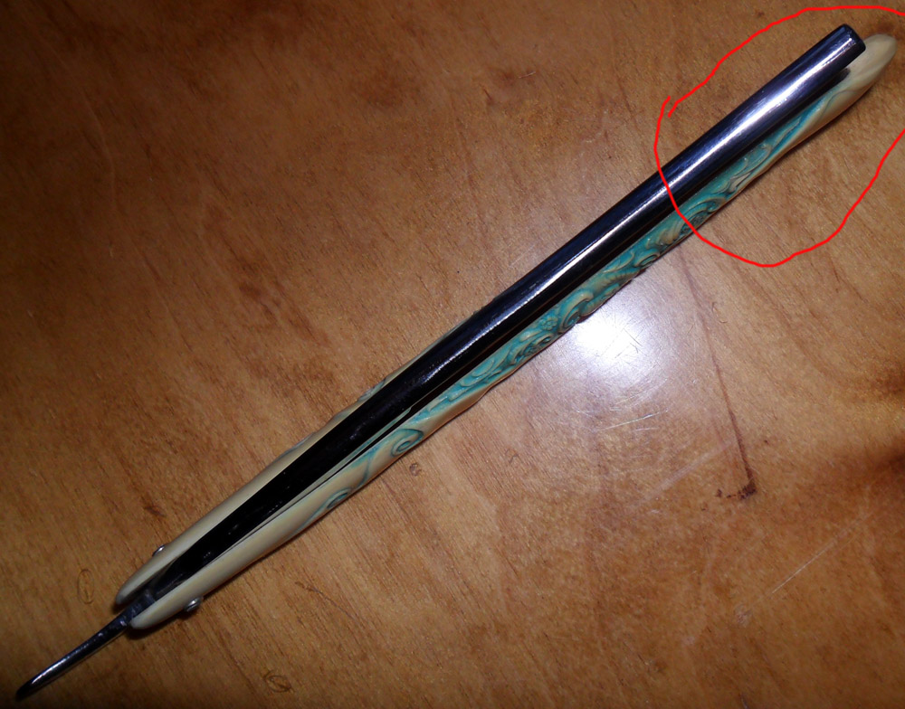 В последнее время мне встретилось несколько бритв, которые закрываются в оправу с "перекосом". Перекос различной степени от "эстетически неприятно" - до "лезвие упирается в одну из половинок оправы" при закрытии бритвы. Половинки оправ ровные (лезвия тоже), видимых искривлений не наблюдается, бритвы не разболтаны, заклепки родные.