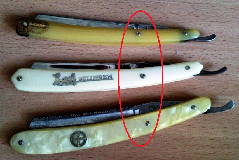 В последнее время мне встретилось несколько бритв, которые закрываются в оправу с "перекосом". Перекос различной степени от "эстетически неприятно" - до "лезвие упирается в одну из половинок оправы" при закрытии бритвы. Половинки оправ ровные (лезвия тоже), видимых искривлений не наблюдается, бритвы не разболтаны, заклепки родные.