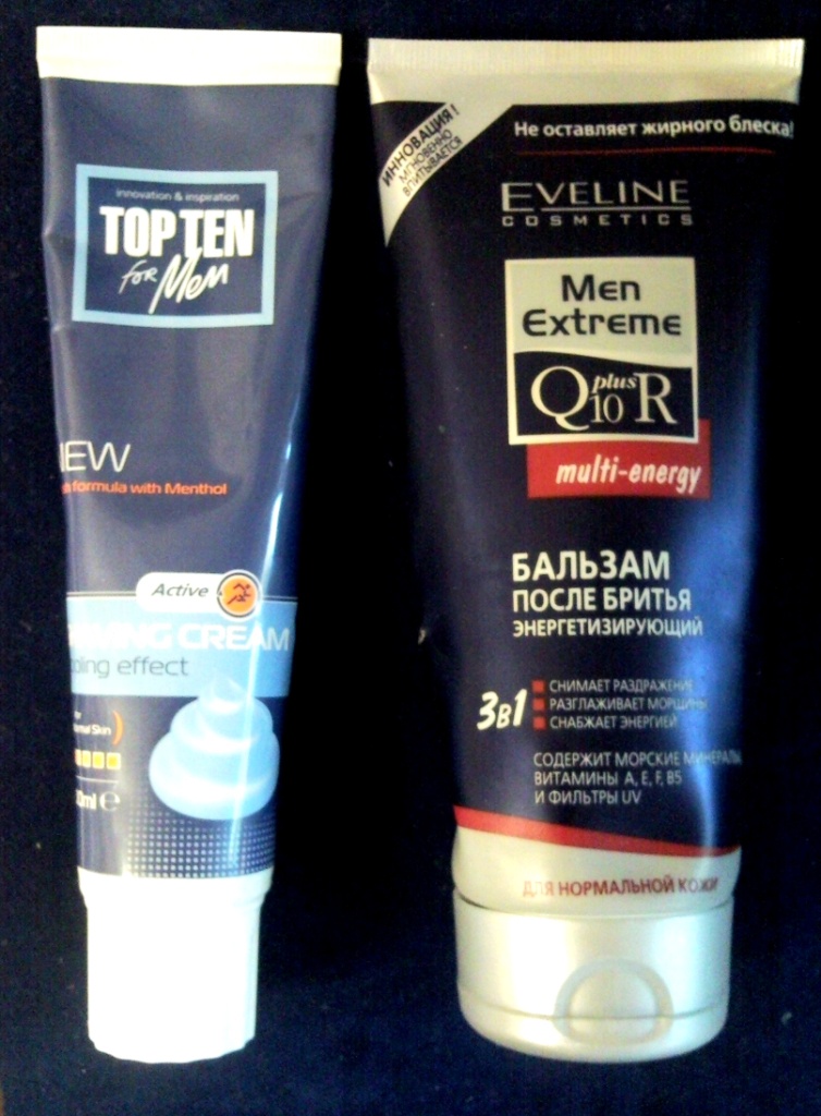 1. Top Ten- Болгария, отлично пенится, во время бритья не сохнет, отлично увлажняет кожу. Цена 1 евро. 2. Men Extreme Q10+R- производитель Eviline Cosmetics , Англия-произведено в Польше. Бальзам отлично впитывается в кожу, снимает раздражение. Цена до 3 евро.