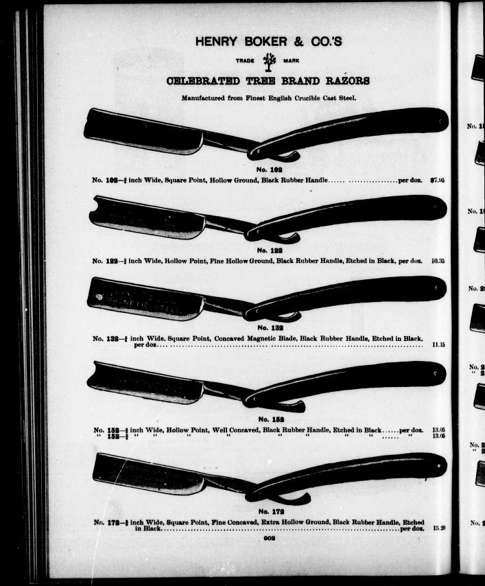 Торговые марки и логотипы: Bicycle (около 1894), Eclipse (около 1903), Edelweiss (около 1902), Hardy Bros. (около 1884), Hilton (около 1932), John Newton, John Primble (Belknap Hardware), Manhattan Cutlery Co. (около 1868), New Haven Cutlery Co., New West R+C (Richards & Connover Hardware), Rainbow (около 1933), R.J.Roberts Razor Co., Razor (около 1905), Red Injun (около 1902), Regal (около 1906), Riverside Cutlery Co. N.Y. (около 1918), Trenton Cutlery Co. (около 1905), Trenton Cutlery Sheffield, Valley Forge Cutlery Co. Newark, N.J. (прямой, около 1916), Valley Forge Cutlery Co. U.S.A. Newark, N.J. (изогнутый), Whitehead & Hoag Co., The W.& H. Co., Wright & Hilhelmy (около 1927).