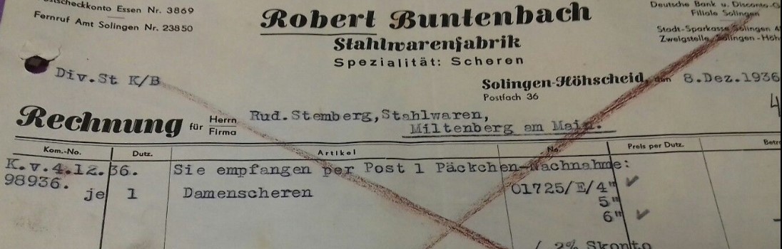 Robert Buntenbach, Robuso, Solingen in 1922 and 1932, Neuenhoferstrasse 75 in 1983. Brand names: 'Bretzel', 'Robuso', 'Stoppelmäher', 'Tambour'. Open-blade razor maker.