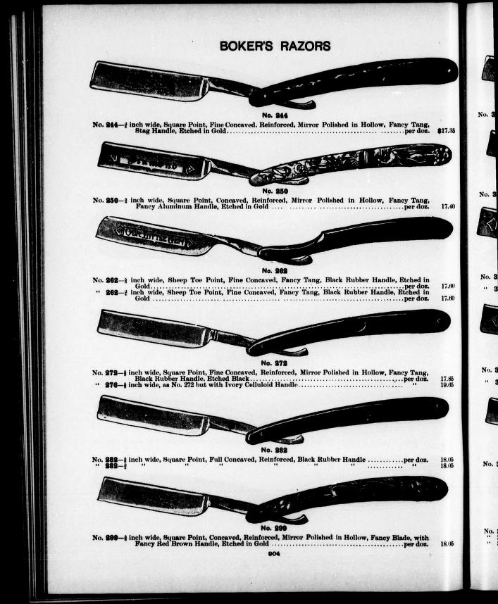 Торговые марки и логотипы: Bicycle (около 1894), Eclipse (около 1903), Edelweiss (около 1902), Hardy Bros. (около 1884), Hilton (около 1932), John Newton, John Primble (Belknap Hardware), Manhattan Cutlery Co. (около 1868), New Haven Cutlery Co., New West R+C (Richards & Connover Hardware), Rainbow (около 1933), R.J.Roberts Razor Co., Razor (около 1905), Red Injun (около 1902), Regal (около 1906), Riverside Cutlery Co. N.Y. (около 1918), Trenton Cutlery Co. (около 1905), Trenton Cutlery Sheffield, Valley Forge Cutlery Co. Newark, N.J. (прямой, около 1916), Valley Forge Cutlery Co. U.S.A. Newark, N.J. (изогнутый), Whitehead & Hoag Co., The W.& H. Co., Wright & Hilhelmy (около 1927).