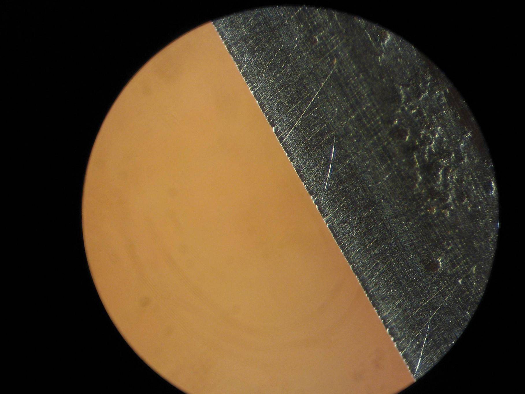 Кто не знает как смотреть при 600 крат и менее остриё, и реснички - это его личные проблемы. Видели люди имеющие электронный микроскоп, кто захочет найдёт снимки в гуглах. Что это? Это структура железа на острие. А заусенец - вытяжение полосы железа, которое никогда не появится при правильной заточке и которое зачастую видно невооруженным глазом. Не надо эти понятия путать. Где там какие реснички? А вот снимок оптическим микроскопом острия бритвы: А вы думали на кожаном ремне за пару движений затачивается РК просто?