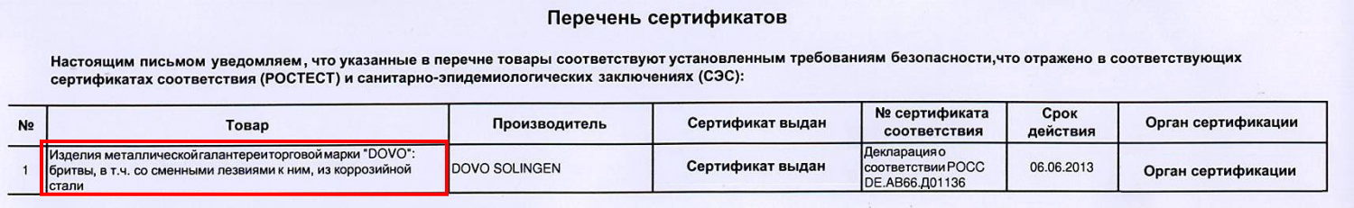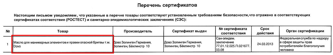 Сертификат к маслу для смазки бритв Dovo Sterol.