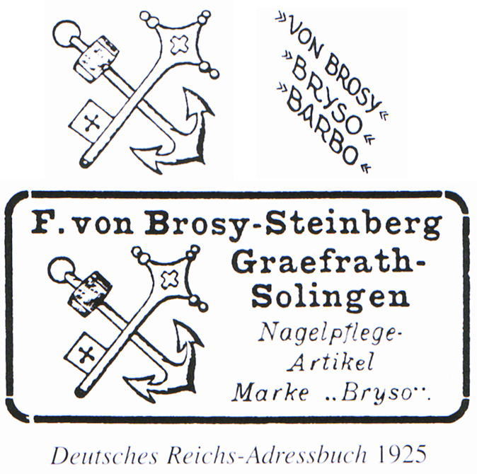 Фабрика F von Brosy-Steinberg, Stahlwarenfabrik, Solingen-Gräfrath была основана в 1872 году и зарегистрирована 2-го июля 1889 года в городе Золинген. Фабрика производила столовые приборы, перочинные ножи, ножницы, бритвенные лезвия и опасные бритвы. Брэнды: Barbo, Bryso, Von Brosy. Торговый знак: скрещенные ключ и якорь. В 1939 году фабрика находилась на улице Wuppertalerstrasse, 251. Хозяева в то время были Hans von Brosy-Steinberg и H Schöpp. В годы Третьего Рейха фабрика занималась также производством холодного оружия. Товарный знак в это время дополнял круг и надпись с названием фабрики и города. Ремонт опасных бритв, звонить с 11-00 до 23-00, +79267729357, (viber, whats app, telegram, VK), спросить Олега.