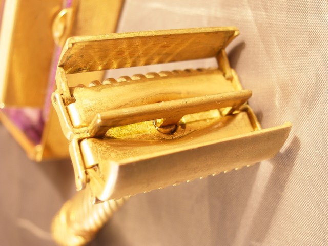 Футляр внутри отделан фиолетовым бархатом, рабочие петли. Латунная коробочка для лезвий, с четким клеймом. Сам станок латунный, механизм открывания и закрывания створок работает как часы. Все в клеймах, на коробочке нанесен орнамент. Состояние и комплектность для такого девайса - безупречное. Станок находится в Москве. Ценник будет 10000 рублей. Доп.фото по запросу.