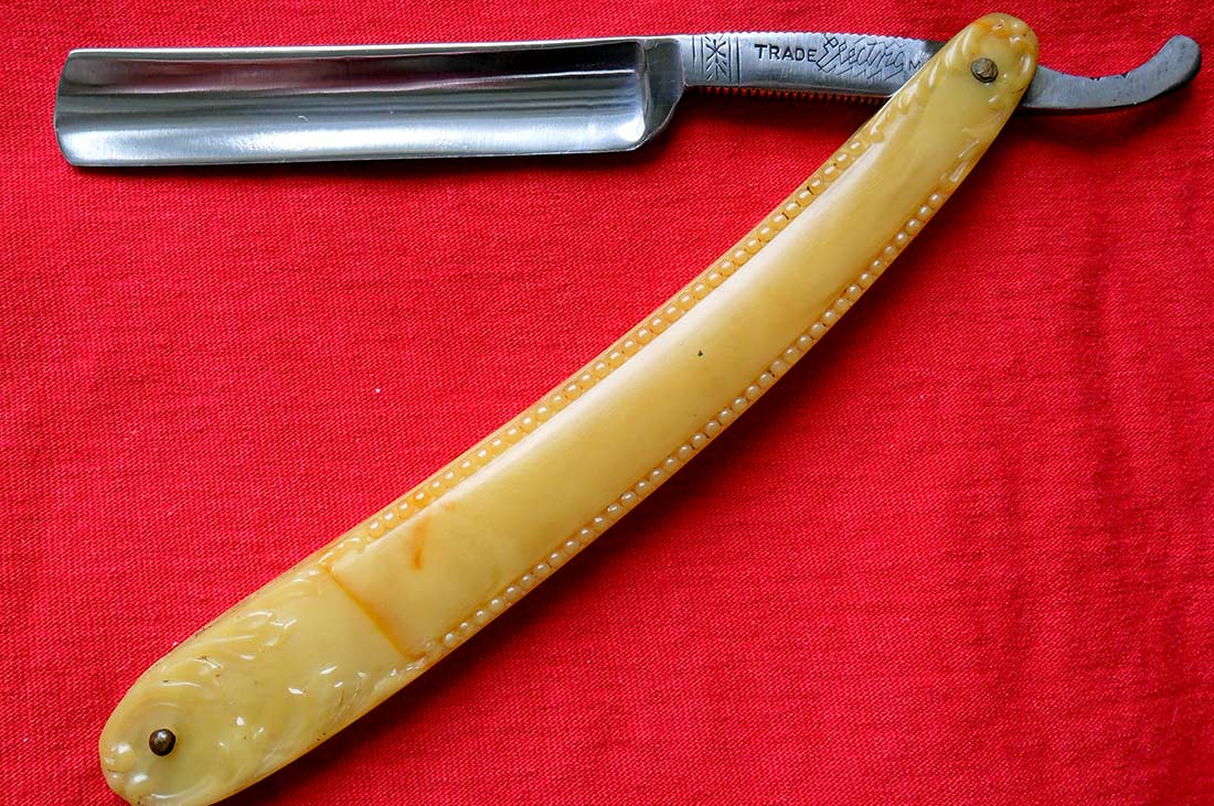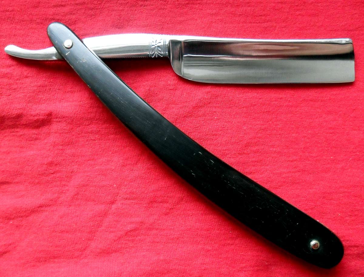 Ручка - натуральный рог в неплохом состоянии, клинышек из металла. По-видимому, ручка родная, пины тоже. Исходя из этого, предполагаю, что бритва относится к концу XIX-началу XX века.