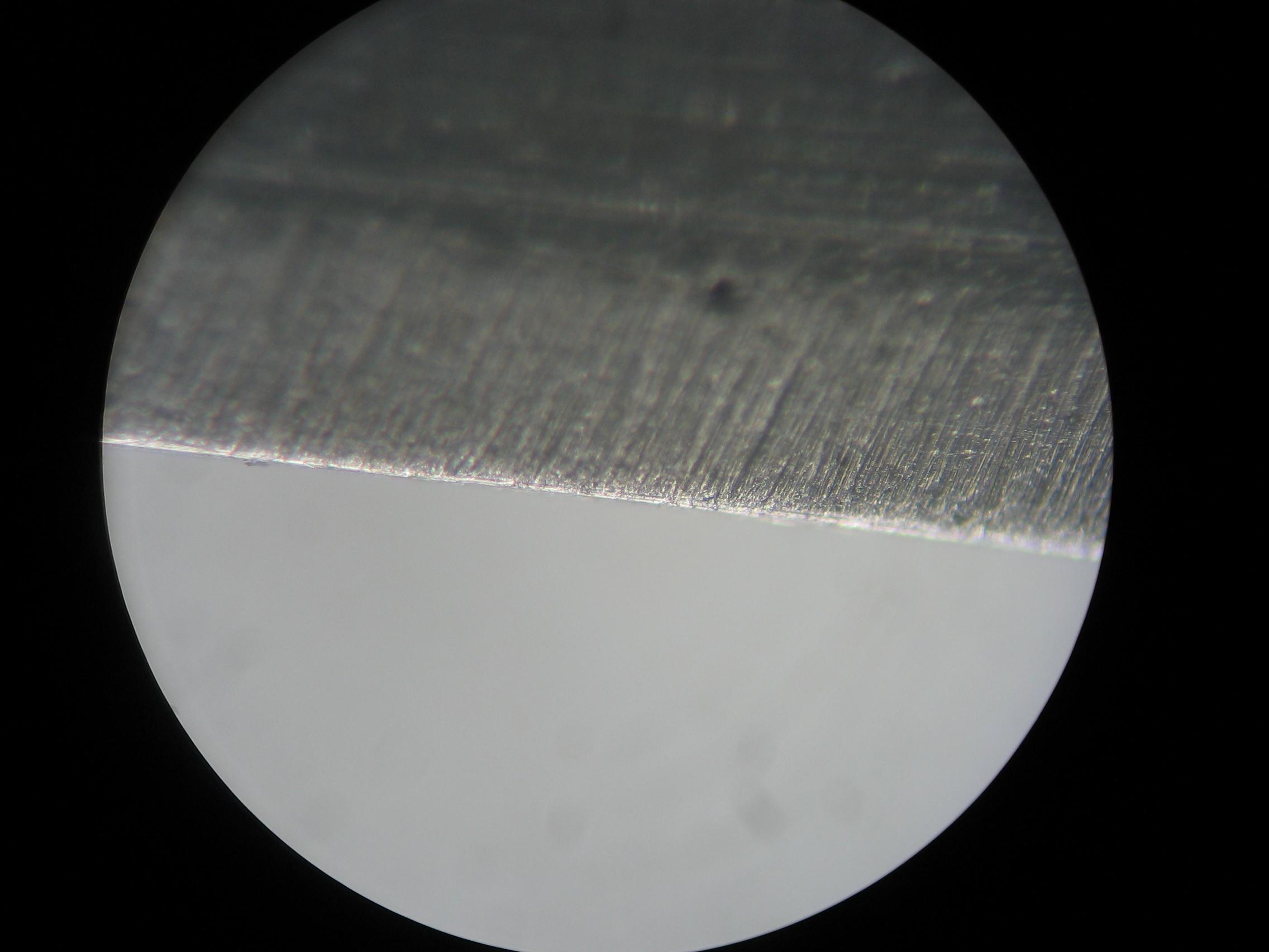 Вот фотка кромки моей японки после советского камня для правки бритв. Правда увеличение маловато  и с освещением надо разобраться.