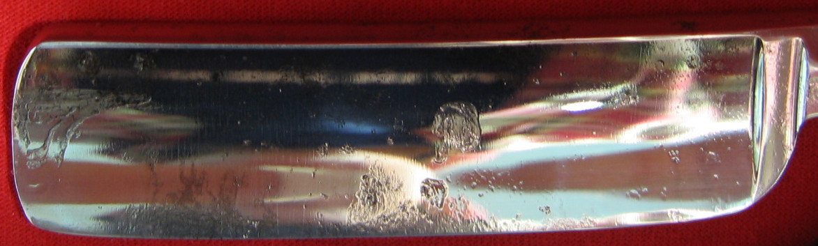 Worcester, Massachusetts ca 1858 - 1963 Размеры в мм.: Длина лезвия 68 Ширина лезвия 20 Обух (спинка) 5 Бритва и ручка без трещин и сколов. На одной стороне лезвия имеются сильные следы от коррозии, но бриться они не мешают - это чисто декоративный дефект. Ручка закрывается ровно и плотно, ручка пластик, возможно бакелит. Внешний вид бритвы: 7/10 Заточка: 8/10, мягко и остро работает, лезвие умерено мягкое. clauss - 1600р