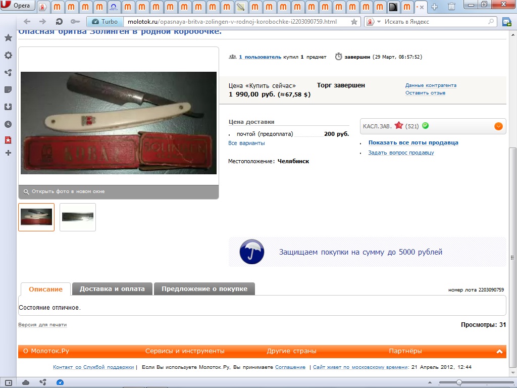 1. г. zykin, с репутацией в один бал, предлагает нам прекрасный ern по начальной ставке всего в каких то жалких 9000 руб. http://molotok.ru/britva-opasnaya-zolin ... 64760.html" onclick="window.open(this.href);return false; 2. г. Яхтинг: С начальной ставкой в 9999 руб, не правда ли цена вполне приличная для столь старой бритвы...У меня есть бритва с цифрой 42, видимо сделана в 42 году от Р.Х., продам всего за 2000 руб! Спешите!!!! http://molotok.ru/opasnaya-britva-wald- ... 52302.html" onclick="window.open(this.href);return false;