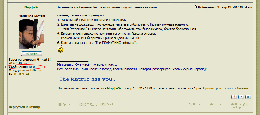 Re: Тема поздравлений!!Я не согласен по поводу OCTOPUSX. Не все сообщения - треп, смысловая нагрузка имела место быть - OCTOPUSX выложил на форум в виде фото достаточное количество бритв (и к ним сопутствующего) из собственной коллекции, лично я просматривал информацию с удовольствием и капающей слюной, и не замечал попыток к "троллингу" и провокаций, не нужно все сводить к междуусобной перебранке. Единственное, что я понял - администрация сайта не сошлась с OCTOPUSX в каких то вопросах (вероятно в бизнес идеях), отсюда нервозность и вражда... Мне, как рядовому форумчанину, это не интересно.... но на столько же и не приятно...