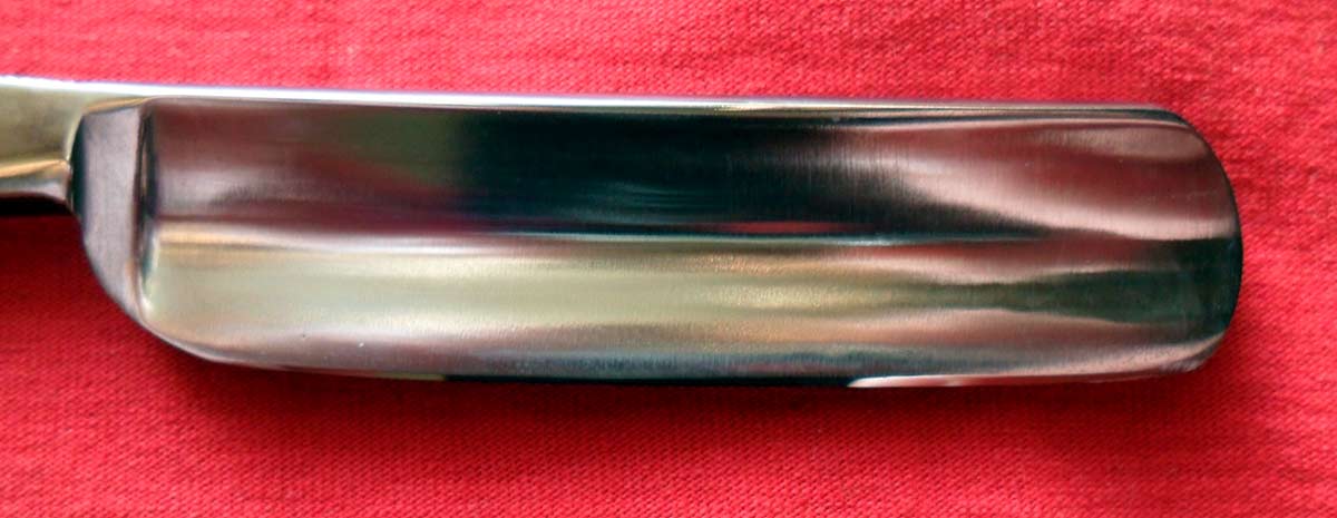 Надпись на полотне: WHOLE HOLLOW GROUND Ручка - эбонит. Очень приятная бритва - хорошо точится, притом хорошо держит заточку - садится после бритья весьма незначительно. 4 дня сравнивал в бритье с парой своих любимых широких бритв. "Старички" победили только в силу привычки, т.к. в бритье я разницы не ощутил - просто прекрасно. Естесственно, заточена и полностью готова к бритью. Ширина полотна 20 мм, толщина в обухе 5,5 мм.