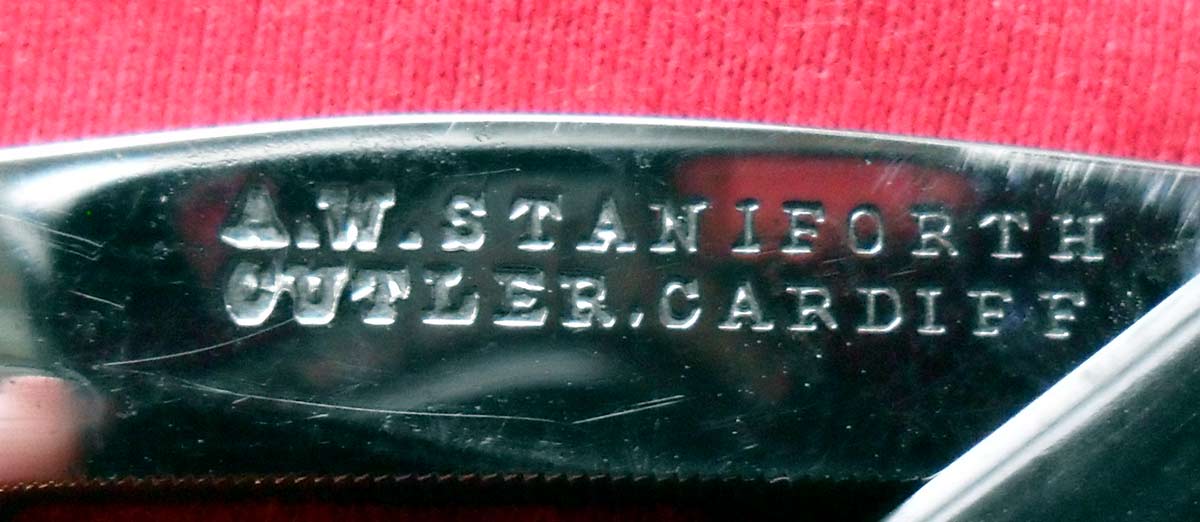 Надпись на полотне: THE CELEBRATED MEDIUM SIZE HOLLOW GROUND RAZOR Сведения о производителе отсутствуют. Согласно надписи на эрле фирма-производитель (или продавец) находились в Кардифе (Уэльс). Сильно сомневаюсь, что бритва изготавливалась в Уэльсе, по стали и внешнему виду на 90% уверен, что это Шеффилд. Да и Уэльс - часть Великобритании, так что все логично. Ручка - рог в очень хорошем состоянии, так хорошо заполирован, что я вначале его принял за бакелит. По-видимому, ручка и пины родные. Клинышек металлический. Естесственно, заточена и полностью готова к бритью. Показалась очень неплохой в бритье. Ширина полотна 17 мм, толщина в обухе 5 мм. .