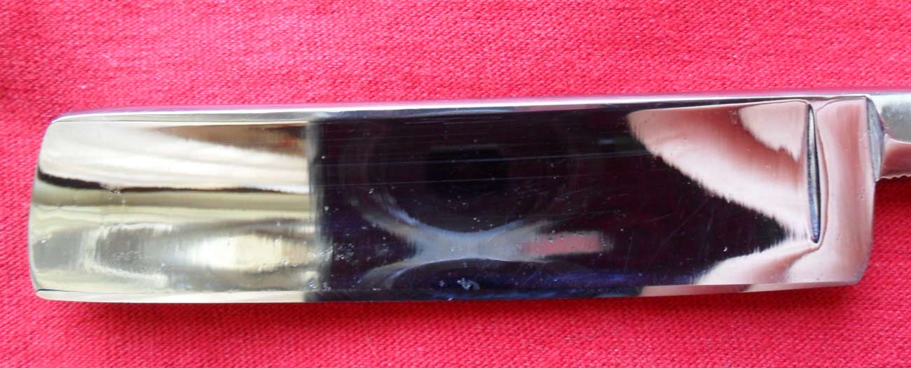 Ручка и пины родные, без проблем. На бритве довольно необычная сталь, заточка потребовала массу времени. Я так понимаю, что сталь высокой твердости, раньше я встречал только 1-2 бритвы со сталью такой твердости. В бритье неплоха, мне понравилась немного больше, чем пара моих прошлых советских бритв 60-х годов, хотя и те были неплохи. Естесственно, заточена и полностью готова к бритью. Также к бритве идет родной чехол в неплохом состоянии. Ширина полотна 17,5 мм, толщина в обухе 4,5 мм.