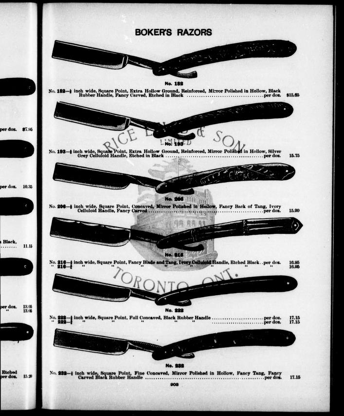 Торговые марки и логотипы: Bicycle (около 1894), Eclipse (около 1903), Edelweiss (около 1902), Hardy Bros. (около 1884), Hilton (около 1932), John Newton, John Primble (Belknap Hardware), Manhattan Cutlery Co. (около 1868), New Haven Cutlery Co., New West R+C (Richards & Connover Hardware), Rainbow (около 1933), R.J.Roberts Razor Co., Razor (около 1905), Red Injun (около 1902), Regal (около 1906), Riverside Cutlery Co. N.Y. (около 1918), Trenton Cutlery Co. (около 1905), Trenton Cutlery Sheffield, Valley Forge Cutlery Co. Newark, N.J. (прямой, около 1916), Valley Forge Cutlery Co. U.S.A. Newark, N.J. (изогнутый), Whitehead & Hoag Co., The W.& H. Co., Wright & Hilhelmy (около 1927).