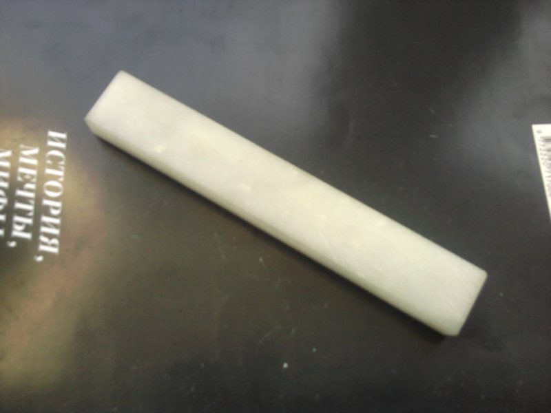 Прошу помощи в определении фамилии камушка.  Камушек белый. Немного прозрачен. Размер: 115*15*9 мм. Фото сделано телефоном у владельца, прошу извинить за качество.