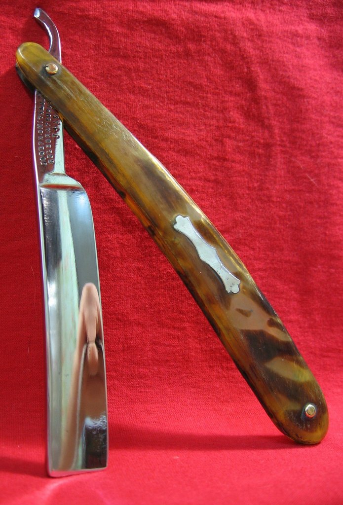 Размеры: длина острия - 73 мм ширина лезвия - 15,5 мм спинка (обух) - 4 мм Фирма существовала с 1828 года, в Англии, г. Шеффилд. Мое мнение, эта бритва произведена в середине-конце 19 века. Ручка, заклепки родные, одна головная шайба на заклепке треснула, но функциональность 100% (под ней ещё одна шайба). Ручка возможно из панциря черепахи, обсуждение этого ведется в этой теме. На ручке вставка из нержавеющего металла, возможно серебра (часто в ручки вставляли серебро), как определить серебро ли - не знаю. Ручка закрывается ровно и плотно, не выпадает. На ручке у правой головной шайбы заклепки имеется трещинка, укрепленная эпоксидной смолой, трещинка никак не дает о себе знать. Само лезвие бритвы без трещин или сколов, как и ручка в прекрасной сохранности для своего возраста, не в идеальном состоянии, имеются следы от бывшей некогда коррозии (см. фото и видео). Моя оценка состояния бритвы: 8,5/10 Моя оценка качества и комфортности бритья (это очень индивидуально и с др. камнями и др. техникой заточки будет по другому): 7-7,5/10