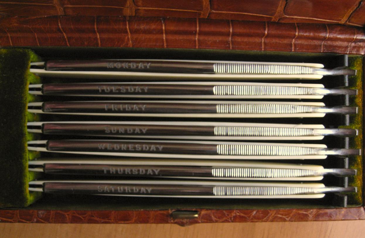 О наборе: Футляр - кожа (красивая фактура), внутри - бархар и черное дерево. Рукоятки бритв скорее всего ivory. Oдна бритва "понедельник" имеет скол носика, другие - в хорошем состоянии, конечно потемнения имеются, но ржи нет. В эксплуатации были "понедельник" и скорее всего "вторник", другие бритвы скорее всего не использовались. Хранились все время в комоде и никогда не доставались (со слов продавца, а его фамилия по прежнему Rosenlew, узнал, когда платил деньги (на аукционе у него ник) ).