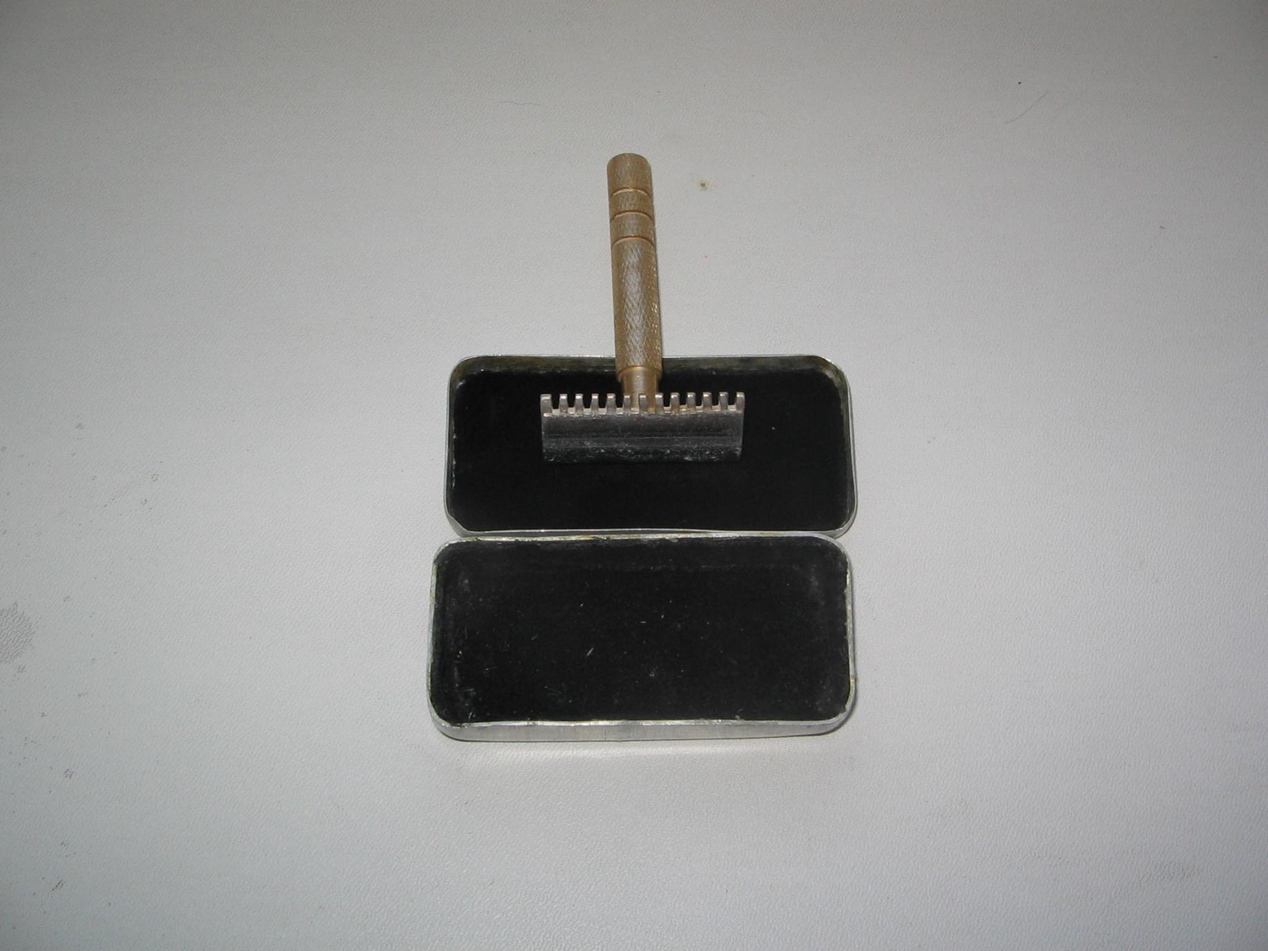 Попробую ответить.... На коробке написано Автоштамп (Мосштамп). Рассматривая клеймо на станке, понял,что клеймо на Мосштамповское не похоже(на моих станках клеймо Мосштампа другое). Ручка желтого металла, головка из светлого... Думаю так могли делать, имею станок, у которого только гребенка такая светлая. Но возможно, что ручка и от другого станка. Сама коробка по виду, буквам и типа материи внутри - смахивает на 30-ые годы прошлого века. Ну, а для бритья должно быть нормально.