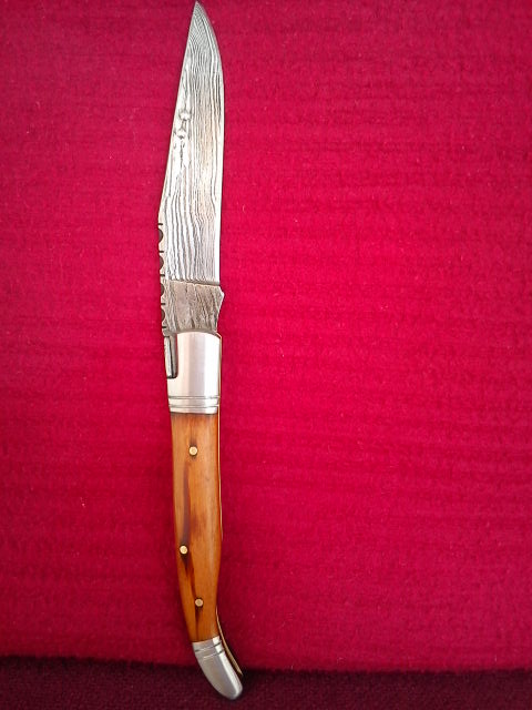 Продам складной нож.Продам складной нож.Дамасская сталь.Общая длина - 21,75 см,длина лезвия - 9,75 см,ручка - 12см.Вес 145 грамм.Ручка из оливкового дерева.Кожаный чехол.Нож новый.Цена 35 евро(почта включена).