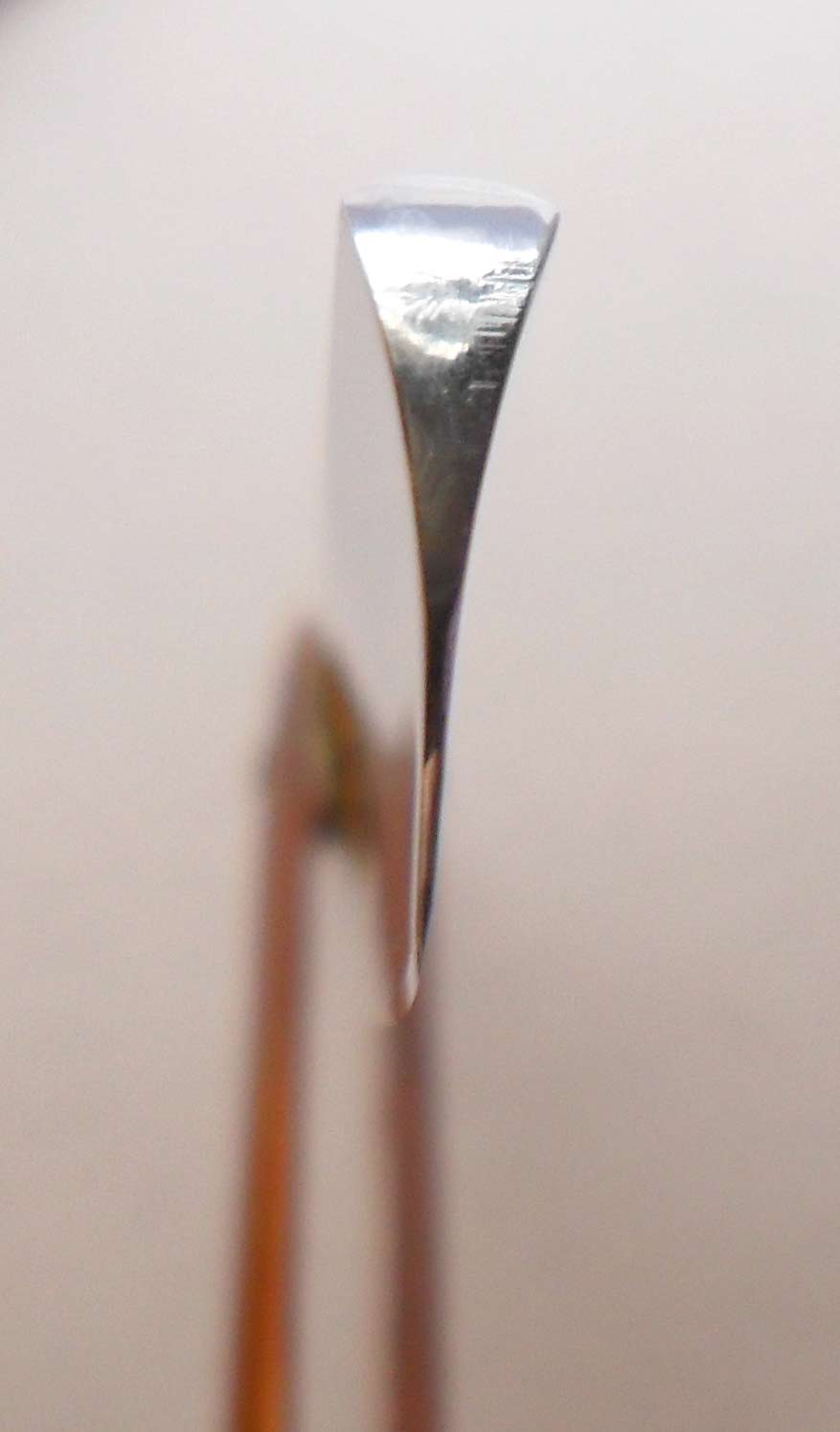 ПРОДАНА Spoiler Show Надпись на полотне: ECLIPSE Ручка и пины, по-видимому, родные, клинышек - металл. Ручка - рог, в прекрасном состоянии. С одной стороны возле головной заклепки пара трещинок-паутинок. Видимо, кто-то пытался неудачно подклепать пин. Трещинки не сквозные, более того, их размер такой, что на фото их не видно. Уверен, что проблем из-за них не возникнет. Естесственно, заточена и полностью готова к бритью. Ширина полотна 19,5 мм, толщина в обухе 5,5 мм.