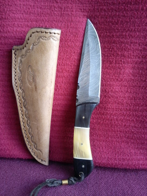 Re: Продам нож.Дамасская сталь.Продам охтничий нож.Новый.Размеры ...общая длина 23 см,длина лезвия 11.5 см.Вес 235 грамм.Чехол из коровьей шкуры.Ручка Blue Pakka Wood(что за дерево не знаю