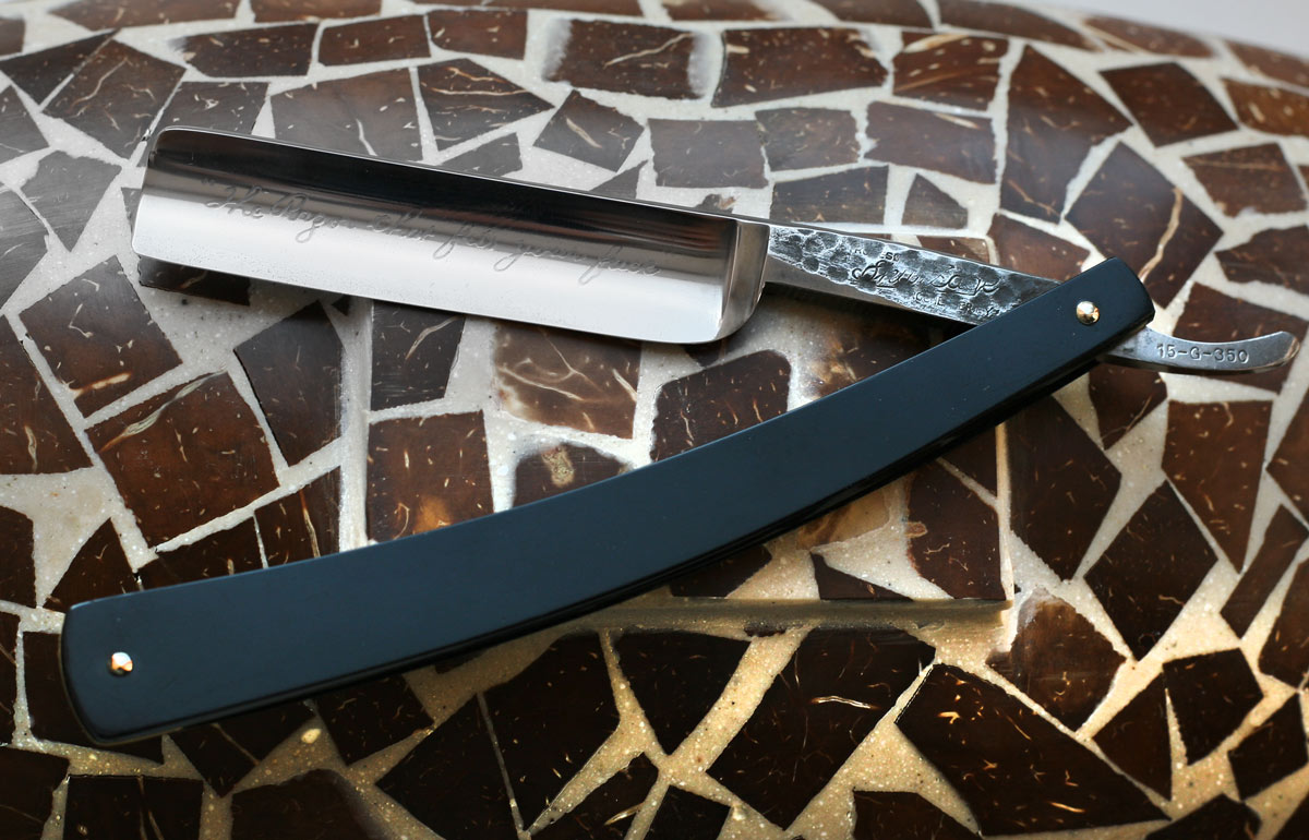 На лезвии выгравировано "The Razor that fits your face"("Бритва, которая соответствует Вашему лицу"). Сказать точно когда сделана эта бритва достаточно трудно. На кованном эрле выбито Robeson Shuredge Rocnester N.Y., если её выпуска ещё The Robeson Cutlery Co.Rocnester N.Y., то это с 1896 по 1922 гг., а если уже Robeson Shuredge Rochester, то с 1922 по 1977. Я склоняюсь ко второму, т.к. такие ручки были весьма популярны с 20х по начало 50х годов 20го века. О данной компании весьма много написано. Начала она своё существование ещё в 1893 как Robeson Cutlery Company в Elmira, Нью-Йорк. В Rochester они переехали в 1894. На протяжении всего времени они выпускали ножи и бритвы. Судя по книгам, в таком сохране родной шерстяной чехол - большая редкость.